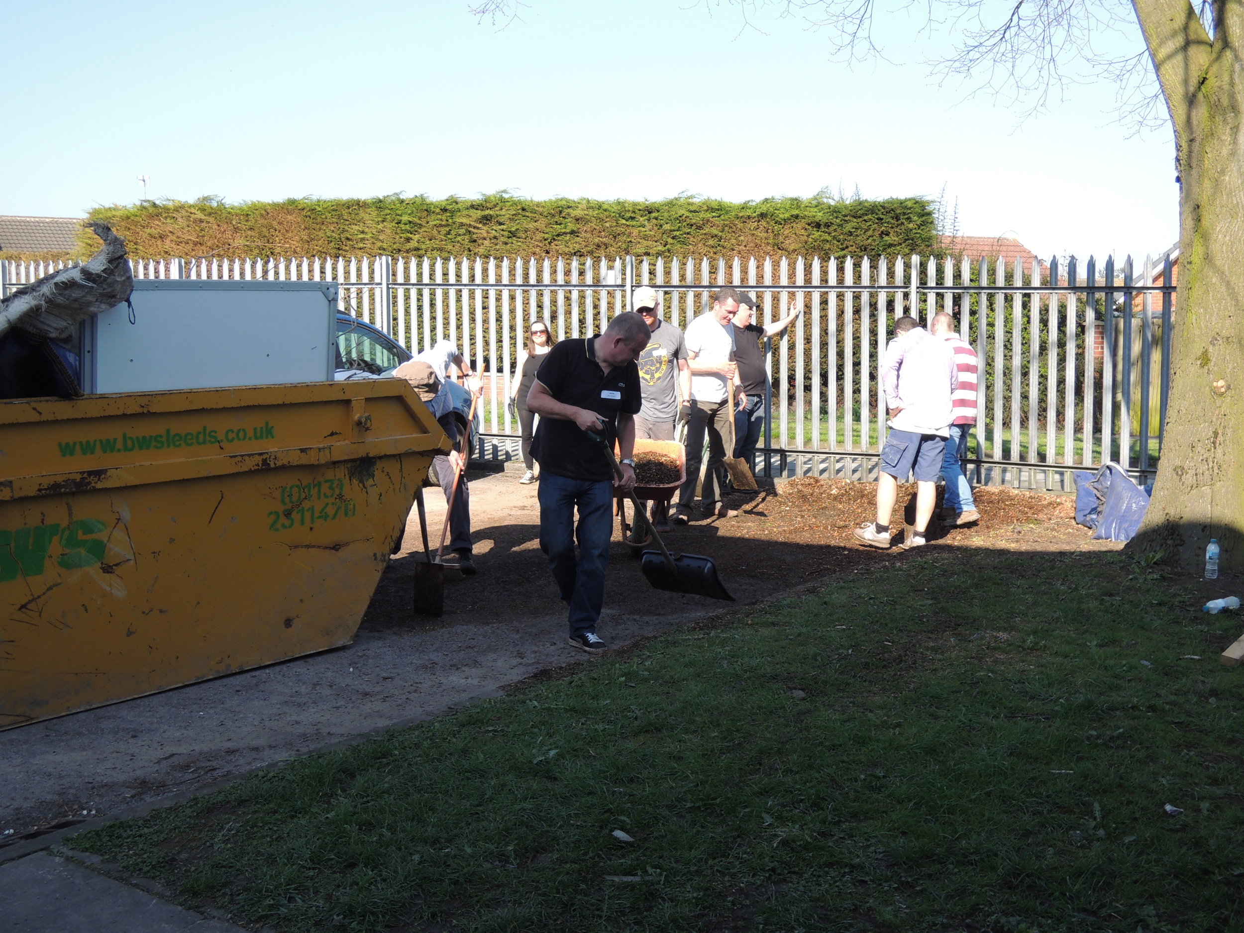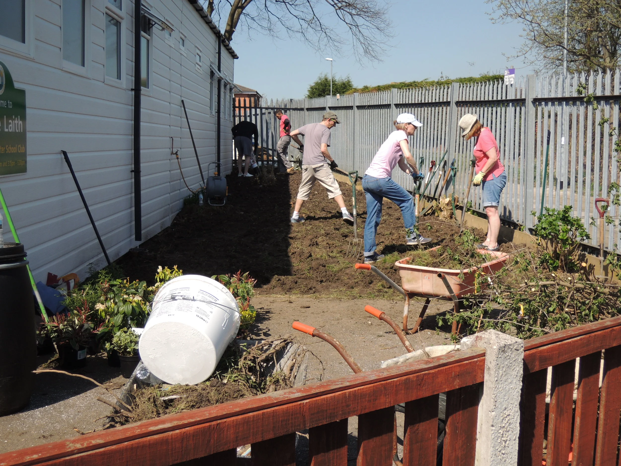 The volunteers then set to work in three teams. The indoor painters painted both rooms and the entrance of our B4A hut. The outdoor painters painted all the wooden fencing in the playground and around nursery. Gardening was the task for the third group and it was tough! They dug out a 35m border along the fence and cleared the area behind the B4A hut. They cleared, dug-over, laid down fabric and woodchip, installed two new raised beds, moved a tonne of top soil and planted 100 plants! The weather was glorious and we all needed lots of drinks and ice-pops to keep us going.